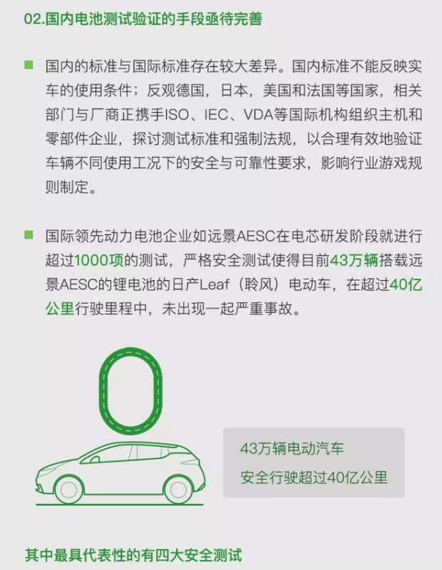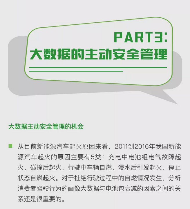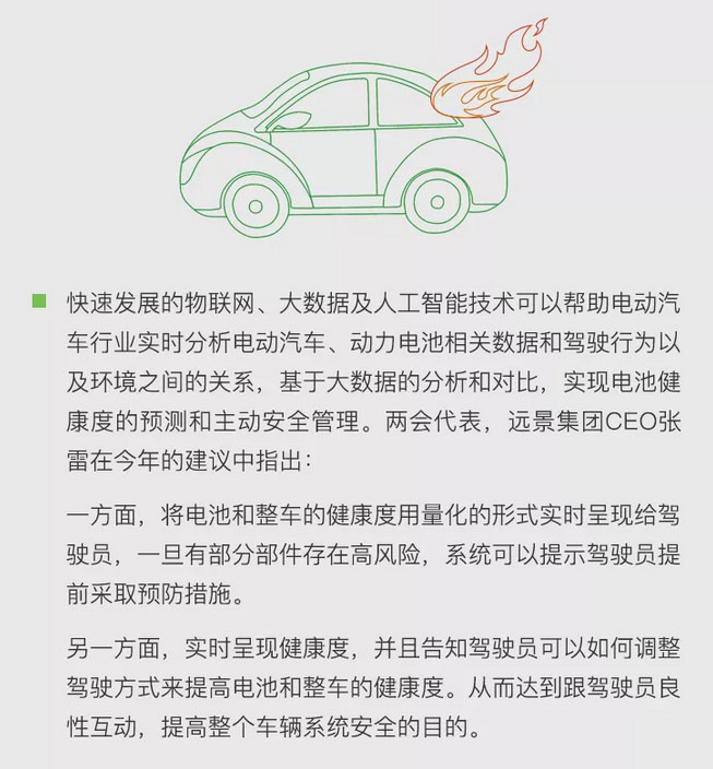 新能源汽車的安全是行業(yè)發(fā)展的“阿喀琉斯之踵”,尤其是動力電池安全。近幾年的新能源汽車事故,大多與電池品質(zhì)有關(guān)。一方面,行業(yè)標(biāo)準(zhǔn)及國家強(qiáng)制標(biāo)準(zhǔn)體系的完善將有助于解決這個問題,另一方面,電池全生命周期的非線性拐點的預(yù)測等大數(shù)據(jù)主動安全管理技術(shù)的提升,將對電動汽車的本質(zhì)安全產(chǎn)生積極影響。