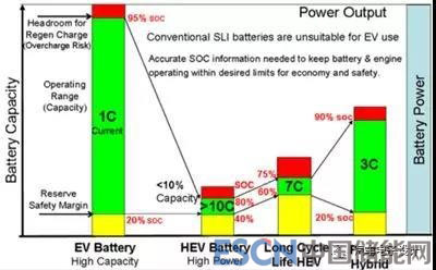 因?yàn)殡姵叵到y(tǒng)在EV和HEV所承擔(dān)的任務(wù)和角色的不同,決定了C值需求的不同。EV強(qiáng)調(diào)的是,大的續(xù)駛里程;HEV或PHEV強(qiáng)調(diào)的動(dòng)力性功率混合能力,包括大電流的能量回收能力。使用功能的差異性,也決定了其限值的不同。