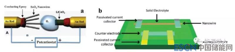 Figure 11. a) 原位TEM的實(shí)驗(yàn)裝置的示意圖。b) 單根納米線電極器件設(shè)計(jì)的示意圖。單根氧化釩納米線或Si納米線是工作電極,HOPG或LiCoO2納米膜是反電極。電解質(zhì)是PEO-LiClO4-PC-EC聚合物。