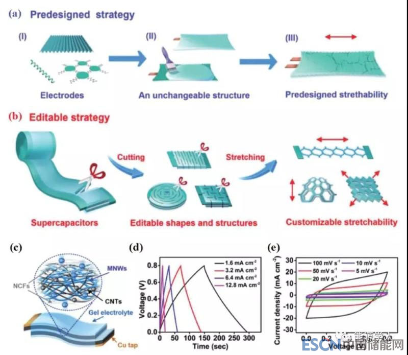 Figure 10. 通過a) 預(yù)先設(shè)計(jì)的策略和b)可編輯策略,可伸縮超級(jí)電容器組裝過程的原理圖。預(yù)先設(shè)計(jì)的策略(a)只能應(yīng)用不可改變的結(jié)構(gòu),并且需要三個(gè)步驟來制備可拉伸的超級(jí)電容器:I)將電極預(yù)先設(shè)計(jì)成可拉伸的結(jié)構(gòu)(例如,上部:波狀結(jié)構(gòu),左下部:類似彈簧的纖維結(jié)構(gòu),右下方:蛇形橋接結(jié)構(gòu)),II)用凝膠電解質(zhì)涂覆結(jié)構(gòu)化電極,和III)重疊結(jié)構(gòu)化電極,用于組裝具有預(yù)先設(shè)計(jì)的拉伸性的可拉伸超級(jí)電容器。預(yù)先設(shè)計(jì)的電極和基板/凝膠電解質(zhì)結(jié)構(gòu)之間的不匹配可能導(dǎo)致在界面處的嚴(yán)重應(yīng)力集中,所述界面引發(fā)微裂紋并促進(jìn)拉伸期間的裂縫傳播。雖然可編輯策略(b)只需要將超級(jí)電容器切割成理想的形狀和結(jié)構(gòu),但可定制的結(jié)構(gòu),如蜂窩狀結(jié)構(gòu),金字塔彈出結(jié)構(gòu),活動(dòng)鉸鏈結(jié)構(gòu)等,使得準(zhǔn)備就緒超級(jí)電容器可以任意方向伸展。紅色箭頭表示具有可定制結(jié)構(gòu)的準(zhǔn)備好的超級(jí)電容器的可拉伸方向。c) 超級(jí)電容器結(jié)構(gòu)的示意圖(側(cè)視圖)。d) 基于MNW70-NCF薄膜電極在不同掃描速率下的柔性超級(jí)電容器的恒電流充電-放電和e) 循環(huán)伏安曲線(CV)曲線。