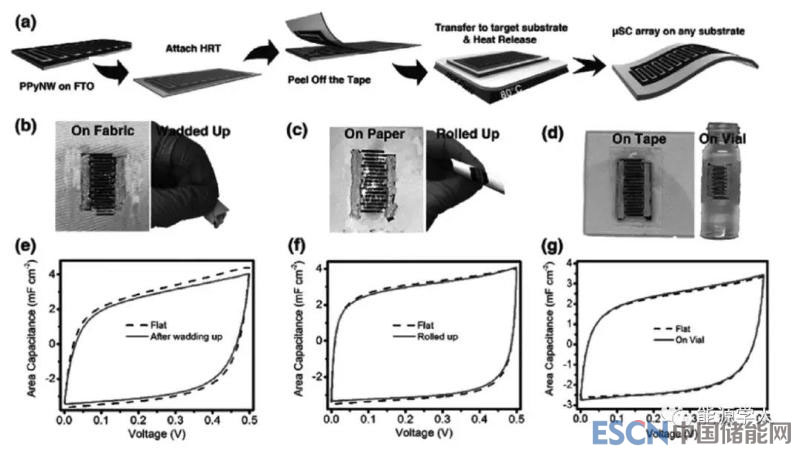 Figure 9. 將PPyNWμSCs轉(zhuǎn)移至目標(biāo)基板的過程的示意圖。b) 紡織品上的PPyNWμSC的數(shù)碼照片,并且被填滿,c) 在紙上并被卷起,和d) 在塑料帶上并附著在小瓶上。e) PPyNWμSC在平坦?fàn)顟B(tài)下和填充后的紡織品的CV曲線,f)在平坦?fàn)顟B(tài)下卷起的紙上的PPyNWμSC,和g)在平坦?fàn)顟B(tài)下的塑料帶上的PPyNWμSC在小瓶上(所有CV曲線在60 mV/s的掃描速率下記錄)。
