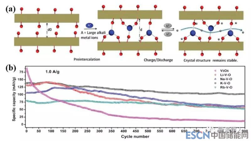 Figure 8. a) 大堿金屬離子嵌入的示意圖。b) A-V-O納米線的循環(huán)性能。