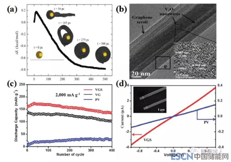 Figure 7. a) 在將石墨烯片包裹到納米線上以形成GS(石墨烯卷軸)期間的每碳能量的變化(插圖是所形成的GS的一系列模擬構(gòu)型)。b) VGS的TEM圖像(插圖給出了GS中V3O7納米線的HRTEM圖像)。c) 在4和1.5 V之間測(cè)試的2000 mA/g的VGS(紅線),VG(V3O7納米線/石墨烯)(黑線)和PV(純V3O7納米線)(藍(lán)線)的恒電流放電曲線. d) VGS和PV的單納米線傳輸特性(插圖是VGS單納米線器件的SEM圖像)。