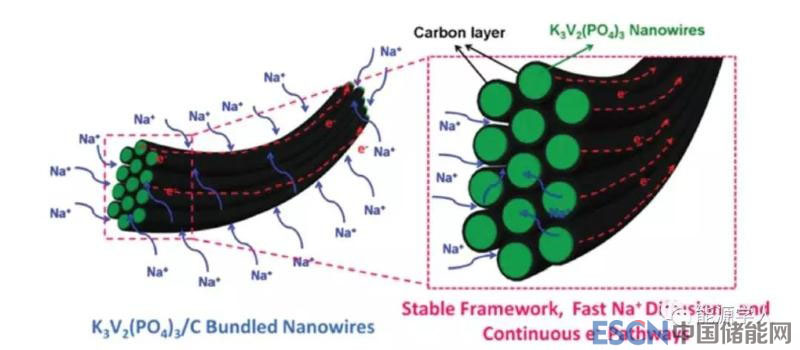 Figure 6. K3V2(PO4)3/C成束納米線的示意圖,具有穩(wěn)定的骨架,快速Na+擴(kuò)散和高電子傳導(dǎo)性。