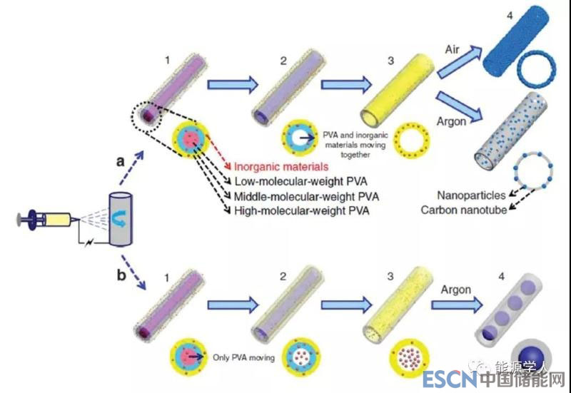 Figure 5. 梯度靜電紡絲和受控?zé)峤夥椒ǖ氖疽鈭D。a) 中孔納米管的制備方法。(1)在靜電紡絲過程之后,低分子量,中分子量和高分子量PVA傾向于在復(fù)合納米線的徑向方向上分布成三層。(2) 隨著溫度的緩慢升高,內(nèi)部低重量PVA首先熱解并向低/中量PVA的邊界移動(dòng),攜帶無機(jī)材料。然后,中等重量的PVA也熱解并向高重量PVA移動(dòng)。(3) 所有初步熱解的PVA和無機(jī)材料在管壁中匯合在一起。(4) 在空氣中燒結(jié)后,得到所有PVA熱解和均勻的中孔納米管,它們由微小的無機(jī)納米粒子組成。另一方面,在氬氣下高溫?zé)Y(jié)后,PVA碳化,得到均勻的中孔納米管,由無機(jī)納米粒子和碳納米管組成。中孔由無機(jī)材料和PVA聚合物的一部分分解產(chǎn)生。b) 豌豆?fàn)罴{米管的制備方法。(1) 在靜電紡絲過程之后,將復(fù)合納米線直接并立即放入空氣中的爐子中,將其預(yù)熱并保持在300 ℃。(2,3) 所有PVA同時(shí)分解并快速移向外部高重量PVA層而不攜帶無機(jī)材料,將它們留在中心。(4) 在氬氣下高溫?zé)Y(jié)后,外部PVA碳化,內(nèi)部無機(jī)材料發(fā)展成納米顆粒,形成豌豆?fàn)罴{米管。