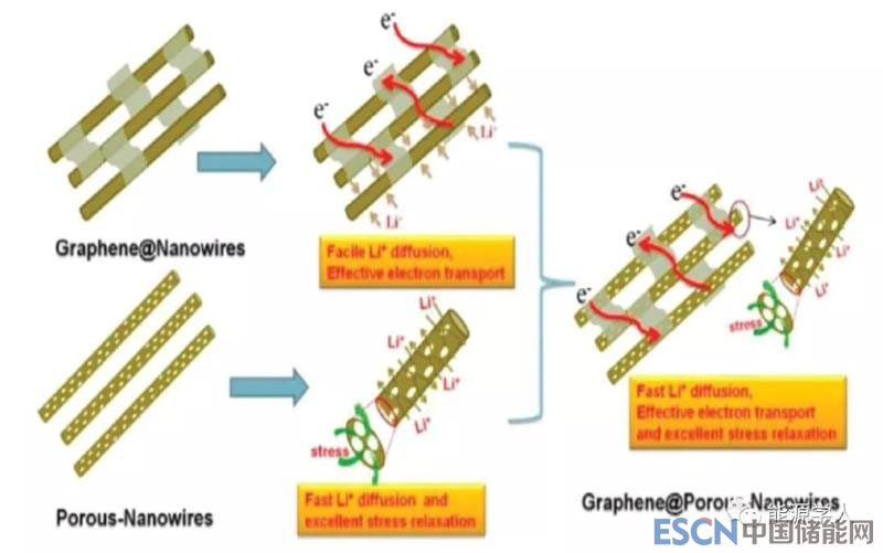 Figure 4. 多孔納米線復(fù)合材料的示意圖,具有快速Li+擴(kuò)散,有效電子傳輸和Li+脫出/嵌入中優(yōu)異的應(yīng)力釋放。