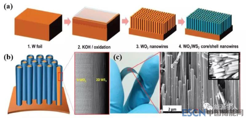 Figure 3. 鎢箔上的核殼納米線工藝和結(jié)構(gòu)表征。a) 在鎢箔上制備h-WO3/WS2核殼納米線的方法的示意圖。b)核殼納米線超級(jí)電容器的單體陣列和納米線的ADF-STEM圖像的示意圖。c) 在機(jī)械彎曲下在鎢箔上制備的核殼納米線的光學(xué)圖像(左)。相應(yīng)的SEM圖像(右圖)顯示了高密度,有序排列的納米線以及它們的側(cè)面(插圖)。插圖中的比例尺為500 nm。