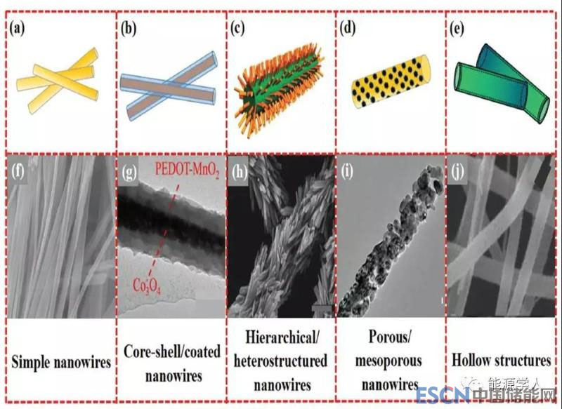 Figure 1. 納米線的不同形態(tài)和結(jié)構(gòu)。a-e) 示意圖,f-j) SEM或TEM圖像。f) NVO納米線g)Co3O4/PEDOT–MnO2核殼納米線c,h) MnMoO4/CoMoO4分級(jí)異質(zhì)結(jié)構(gòu)納米線。i) NiO/CoN多孔納米線 j) SnO2介孔納米管。