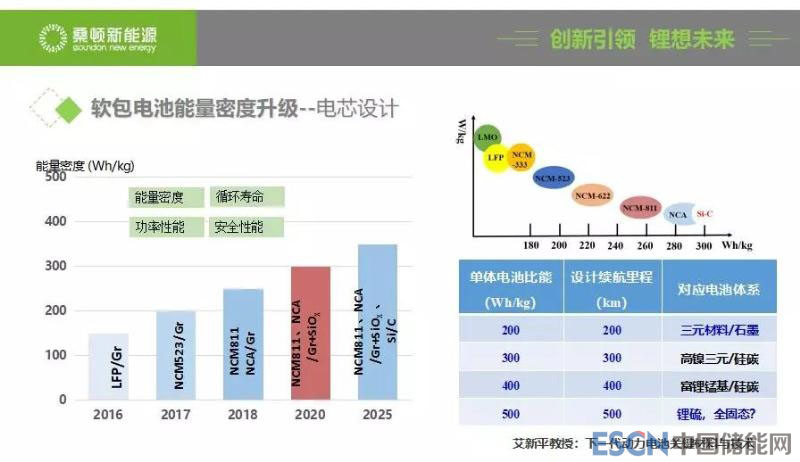 不但如此,技術(shù)發(fā)展趨勢(shì)與電池系統(tǒng)能量密度的提升更是息息相關(guān),是各國(guó)提升電池技術(shù)努力的主要目標(biāo)之一。那么未來(lái)的主流技術(shù)路線是怎樣隨著時(shí)間而改變的呢?婁忠良對(duì)此的詮釋是:“2017年開(kāi)始,國(guó)內(nèi)主流的電池廠加大了三元布局,現(xiàn)如今高鎳高壓三元和硅碳是主流的技術(shù)路線。當(dāng)能量密度在200Wh/kg至280 Wh/kg之間時(shí),正極從低鎳到高鎳,或者低壓到高壓演變;當(dāng)能量密度達(dá)到280 Wh/kg至300 Wh/kg之時(shí),負(fù)極由石墨進(jìn)化到硅碳;當(dāng)能量密度提升至300Wh/kg至350Wh/kg時(shí),富鋰錳基電池將取代三元;350Wh/kg以上時(shí),電解質(zhì)將從液態(tài)變成固態(tài),或者鋰離子電池體系將向鋰硫電池或全固態(tài)電池發(fā)展?!?