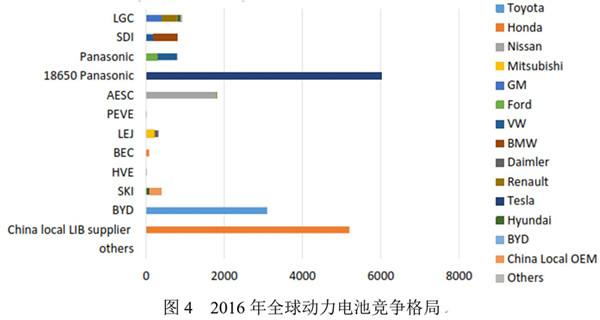目前全球動(dòng)力電池配套的配套供應(yīng)商主要集中于日、韓、中三國(guó),2016年鋰動(dòng)力電池競(jìng)爭(zhēng)格局為:日系、韓系新能源汽車配套日韓主機(jī)廠控股或合資合作的動(dòng)力電池企業(yè)產(chǎn)品;美系新能源汽車配套日韓動(dòng)力電池企業(yè)產(chǎn)品,其中特斯拉正在籌建自己的超級(jí)動(dòng)力電池工廠;歐系新能源汽車配套日、韓、中三國(guó)領(lǐng)先的動(dòng)力電池企業(yè)產(chǎn)品。這些整車廠的純電動(dòng)與插電式混動(dòng)汽車都至少選擇了2~3家動(dòng)力電池供應(yīng)商。