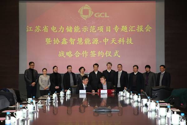 中國儲能網(wǎng)訊:2月23日,江蘇省電力儲能示范項(xiàng)目專題匯報(bào)會暨協(xié)鑫智慧能源-中天科技戰(zhàn)略合作簽約儀式在蘇州協(xié)鑫能源中心舉行。在江蘇省經(jīng)信委副主任李強(qiáng)等領(lǐng)導(dǎo)的見證下,協(xié)鑫電力集團(tuán)執(zhí)行總裁王世宏、協(xié)鑫智慧能源分布式能源事業(yè)部總裁徐庭陽分別與中天儲能科技有限公司總裁薛馳、總經(jīng)理繆永華簽署了戰(zhàn)略合作框架協(xié)議和協(xié)鑫智慧能源10MWh鋰電儲能項(xiàng)目商務(wù)合同。