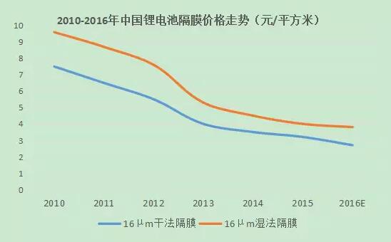 就具體價格來看,在新增產(chǎn)能的沖擊下,國產(chǎn)隔膜價格出現(xiàn)了快速下滑,近五年,國產(chǎn)16μm濕法隔膜市場均價為從2010年的9.5元/平米下降到2015年為4元/平米;16μm干法隔膜均價從2010年的7.5元/平米下降到2015年的3.5元/平米,跌幅均超過了50%。隔膜價格大幅下滑主要是由于國內(nèi)中低端產(chǎn)能迅速擴張,隔膜企業(yè)采用低價競爭戰(zhàn)略占據(jù)市場;此外,下游電芯行業(yè)也存在中低端產(chǎn)能過剩和無序競爭問題,為低端低價格隔膜產(chǎn)品提供了生存土壤。