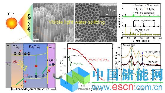 針對金屬氧化物在可見光區(qū)水分解性能低的科學(xué)問題,研究人員提出一種通過形成“矢量遷移通道”的能級結(jié)構(gòu)來引導(dǎo)光生載流子遷移的途徑。實(shí)驗(yàn)上,通過將一層2~3 nm厚的Fe2TiO5窄禁帶(2.2 eV)半導(dǎo)體材料包覆在高度有序的TiO2納米管陣列表面,在Fe2TiO5/TiO2之間形成載流子分離界面,成功地將光生空穴從材料內(nèi)部定向遷移到表面催化反應(yīng)活性位點(diǎn);同時(shí),F(xiàn)e2TiO5與TiO2匹配的導(dǎo)帶結(jié)構(gòu)極大減小了水分解反應(yīng)的過電勢,從而使得Fe2TiO5-TiO2復(fù)合結(jié)構(gòu)在400-600nm波長范圍的量子轉(zhuǎn)換效率高達(dá)40%以上,總的能量轉(zhuǎn)換效率達(dá)到2.7%。研究人員還利用同步輻射X射線吸收譜學(xué)和電化學(xué)阻抗譜技術(shù)等一系列測量和理論分析,證實(shí)了Fe2TiO5-TiO2界面的“矢量遷移通道”能級結(jié)構(gòu)是實(shí)現(xiàn)光生載流子定向遷移的原因。