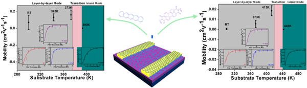 定量分析了第一分子層在有機(jī)場效應(yīng)晶體管中的作用。他們制備了基于石墨烯電極的高性能的單分子層和多層p型并五苯和n型苝酰亞胺場效應(yīng)晶體管(圖5),并證實(shí)了第一分子層在薄膜生長和器件傳輸性質(zhì)中起到的重要作用。他們獲得了有關(guān)擴(kuò)散動(dòng)力學(xué)和薄膜形貌隨著襯底溫度變化的關(guān)系,發(fā)現(xiàn)了兩種分子生長模式的轉(zhuǎn)變,以及不同的擴(kuò)散活性,進(jìn)而加深了對(duì)熱動(dòng)力學(xué)控制的有機(jī)分子生長的了解。同時(shí),他們發(fā)現(xiàn)高質(zhì)量的第一分子層有利于晶體管器件整體性能的提高。因此,獲得連續(xù)性好的,有序性高的第一分子層,也是獲得高性能的有機(jī)場效應(yīng)晶體管的重要途徑。相關(guān)研究發(fā)表在近期的《先進(jìn)材料》(Adv. Mater., 2012, 24, 1471)上。