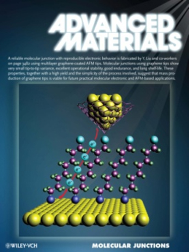 多層石墨烯修飾導(dǎo)電原子力顯微鏡針尖。他們發(fā)現(xiàn)借助多層石墨烯修飾的導(dǎo)電AFM針尖,相比于傳統(tǒng)的金導(dǎo)電針尖,能夠獲得高性能的,重復(fù)性高的分子結(jié)(圖6)。通過對(duì)硫醇分子結(jié)的電荷傳輸行為的表征,他們發(fā)現(xiàn)由石墨烯修飾的針尖構(gòu)建的硫醇分子結(jié)的電阻差異性只有2左右,而金導(dǎo)電針尖測得的硫醇分子結(jié)的電阻差異性最大達(dá)到了3個(gè)量級(jí)。結(jié)果表明石墨烯修飾針尖有利于降低金導(dǎo)電針尖上的污染程度,從而獲得重復(fù)性好的分子結(jié)。他們進(jìn)一步發(fā)現(xiàn)石墨烯修飾的針尖具有出色的操作穩(wěn)定性,連續(xù)3600s的長時(shí)間操作,基于此針尖的硫醇分子結(jié)的電流略微降低。相比于金導(dǎo)電針尖,石墨烯修飾的針尖不易磨損,連續(xù)操作12小時(shí)后,分子結(jié)的電流無明顯變化。同時(shí),他們將石墨烯修飾的針尖放置于空氣中60天后,發(fā)現(xiàn)基于烷基硫醇分子結(jié)的電阻差異性并無多大變化。這一結(jié)果說明石墨烯修飾的針尖的空氣穩(wěn)定性十分出色,相比于金導(dǎo)電針尖不易氧化,進(jìn)一步證明了石墨烯修飾的針尖可以作為一種研究分子結(jié)的電學(xué)性質(zhì)的有效工具。相關(guān)研究發(fā)表在近期的《先進(jìn)材料》(Adv. Mater. 2012, 26, 3482)上,并被該雜志選為frontispiece。Wiley出版社在Materials Views(中國)網(wǎng)站報(bào)道了該結(jié)果。