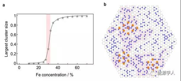 圖7. 由處于鈉層相鄰兩個過渡金屬氧化物層中的鐵連接鈉位構成的網絡的逾滲(percolation)模擬。a)模擬得出的逾滲閾值大約對應鐵的成為為30%時。b)對應于鐵的成分為28%的一個例子。藍點和灰點是兩個相鄰層中鐵和非鐵的其他過渡金屬的投影位置。粉紅點是由鐵連接的鈉位點,橫跨整個模擬區(qū)域。橙色點是三個鈉團簇的例子。