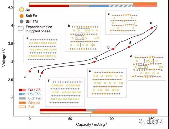 圖6. 含鐵鈉層狀化合物結構演變的示意圖。此處以FC在2.5和4 V之間循環(huán)的充放電滯回曲線和對應點a-f處的微觀結構示意圖為例。六個插圖a-f是在電壓曲線上標記出的相應狀態(tài)下沿b方向的微觀結構示意圖。(a) O3相中完全充滿的鈉層和平直的過渡金屬氧化物層。(b) 金屬氧化物層中的鐵離子逐漸被氧化并開始軟化。黑色虛線包含了將要在褶皺相中膨脹的區(qū)域和因此首先被提取出的鈉離子。(c) 鈉含量更低時,過渡金屬層處于褶皺相。鐵離子被進一步氧化,扭曲和軟化周圍環(huán)境。(d) 與(b)-(c) 過程中黑框內的鈉離子首先被提取不同,放電時鈉離子將首先被插入到黑框區(qū)域中,導致了關于充放電不對稱的演化路徑。(e, f) 隨著鈉含量增加,金屬氧化物層又回到平直狀態(tài)。
