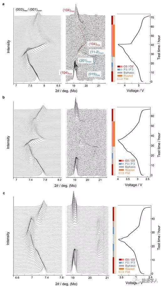 圖5. 對于FC在C / 50下截止電壓為 (a) 4.5V,(b) 4V, (c) 3.6V 的原位XRD測量以及對應的電壓曲線和相圖。相分析的細節(jié)如 (a) 所示。對于(b)和 (c) 可進行類似的分析。