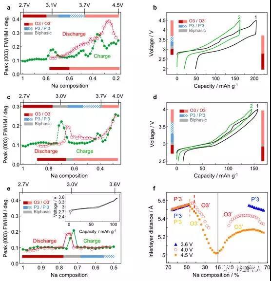 圖4. 不同電壓截止條件下Na[Fe0.5Co0.5]O2 (FC)的結構演化和電壓滯回曲線 (a)FC在2V和4.5V之間循環(huán)的原位XRD (003)峰的半高寬數據和充電(頂部)和放電(底部)的關于鈉含量的相圖。(b) 相應的截止電壓為4.5V的電池循環(huán)測試的第一和第二次循環(huán)的電壓曲線以及充電(左)和放電(右)的關于電壓的相圖。(c, d) 循環(huán)電壓范圍為2V到4.0V。其余同(a, b)。 (e) 循環(huán)電壓范圍為2V到3.6V。相演化對于充電和放電相同。插圖:高度對稱的第一個循環(huán)的電壓曲線。(f) (a), (c) 和 (e) 中每個原位XRD測量中層間距離的演變。原位XRD測試和電池測試的速率分別為C / 50和C / 10。注意這里P'3代表具有單斜變形的P3相,而O3'代表另一個O3相高壓,具有加寬的(003)XRD峰。