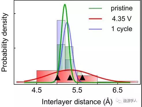 圖3. 根據HAADF-STEM圖像(圖2 d-f)中的實際強度分布測量得到的原始MFCN (綠色),充電至4.35 V(紅色),經過一個電池循環(huán)周期后(藍色)的層間距離的分布。曲線是直方圖數據的均值和方差對應的高斯分布。三個黑色三角形對應于在褶皺結構的DFT計算中的層間距離(圖1a)。