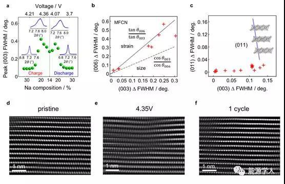 圖2. 通過原位XRD和球差校正的STEM觀察到褶皺相的相關現象。 (a) 原位XRD測量得到的 (003) 衍射峰的半高寬。以C / 50速率充電至4.5V的過程在約43小時結束,相應的剩余鈉離子的標稱值為14%。插圖從左到右是充電過程中在鈉含量為28%和18%時以及放電時相應位置的(003)峰的實際XRD曲線。在圖上方邊緣標出了對應電壓值。 (b) 實測得到的 (003) 和 (006) XRD峰半高寬的角度依賴性與應變展寬(實線)和尺寸展寬(虛線)相比較。每個紅色標記對應于原位XRD掃描結果,與應變展寬模型十分接近。 (c) (011) 與 (003) 平面對應的的XRD展寬對比。插圖中的模型指明了 (011) 平面的方向。說明在金屬氧化物面內沒有明顯的應變分量。 (d-f) 為MFCN在b方向的HAADF-STEM圖像。所使用的分別為樣品是 (d) 原始薄膜,(e) 以C / 10速率充電至4.35V和 (f) 在C / 10速率下2V至4.5V之間的一個循環(huán)之后。亮斑點表示過渡金屬離子的位置。
