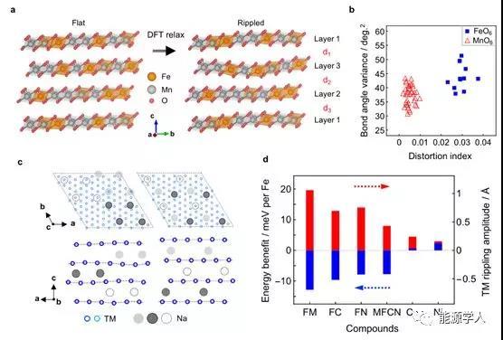圖1. 對于自發(fā)褶皺相變的DFT計算。(a) 鈉層全空的O3型Fe0.25TM0.75O2從不穩(wěn)定的平直結構經過DFT弛豫到了褶皺結構。 (b) 量化 (a) 中所示DFT弛豫得到的褶皺結構,FeO6的形變度顯著高于MnO6八面體。 (c) 在鈉層非空的情況下,具有不均勻分布(團簇)鈉離子的結構中也能觀察到褶皺現象,而在鈉離子均勻分布的情況下金屬氧化物層保持平直。(d)比較 (c) 中所述兩種情況,鈉團簇與褶皺結構耦合的狀態(tài)在各種不同鐵比例鈉層狀化合物均表現為低能態(tài),且褶皺的幅度總體隨著含鐵量增加而增強。對于x軸標簽,從左至右分別代表Nax[Fe0.5Mn0.5]O2, Nax[Fe0.5Co0.5]O2,Nax[Fe0.5Ni0.5]O2,Nax[Mn0.25Fe0.25Co0.25Ni0.25]O2,NaxCoO2和NaxNiO2(x = 1/9)。