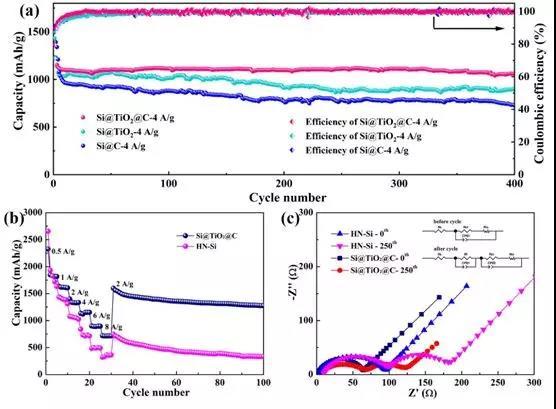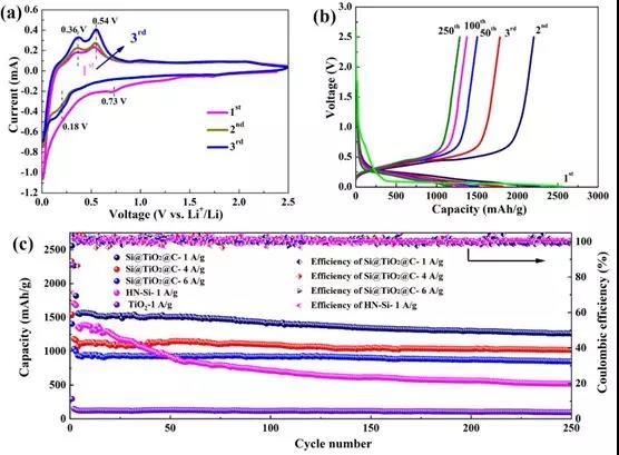 結(jié)果表明,以鎂熱還原法和溶膠凝膠法合成的具有雙層穩(wěn)定的空心Si@TiO2@C納米球負(fù)極材料,在0.2A/g的電流密度、0.01-2.5V的工作電壓下,首次放電比容量為2557.1mAh/g,庫(kù)倫效率為86.06%。在1A/g的電流密度下,250次循環(huán)后Si@TiO2@C負(fù)極材料的可逆比容量仍有1270.3mAh/g。而沒(méi)有包覆的HN-Si負(fù)極材料首次放電比容量為2264mAh/g,庫(kù)倫效率僅為67.3%。