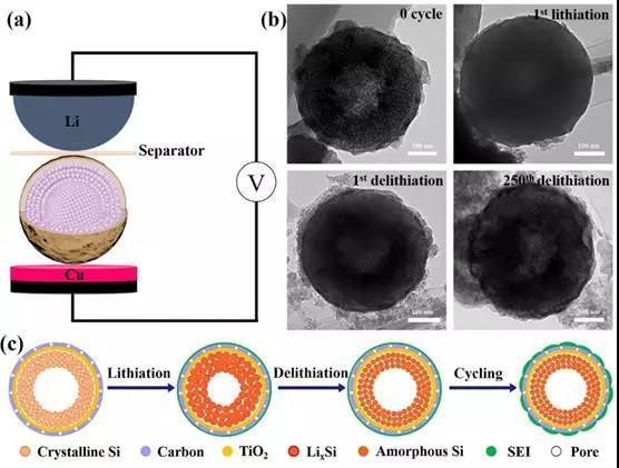 ▲圖4 Si@TiO2@C(a)工作裝置示意圖、(b)TEM下充放電的結(jié)構(gòu)變化和(c)鋰化(去鋰化)示意圖