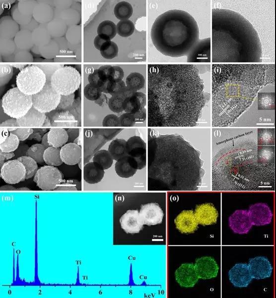 ▲圖2 SiO2(a,d-f)、HN-Si(b,g-i)以及Si@TiO2@C(c,j-l)的電鏡圖