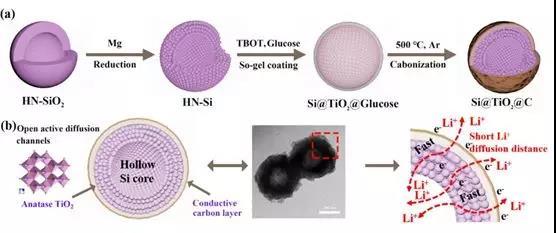 ▲圖1 Si@TiO2@C負(fù)極材料的(a)制備示意圖和(b)結(jié)構(gòu)示意圖