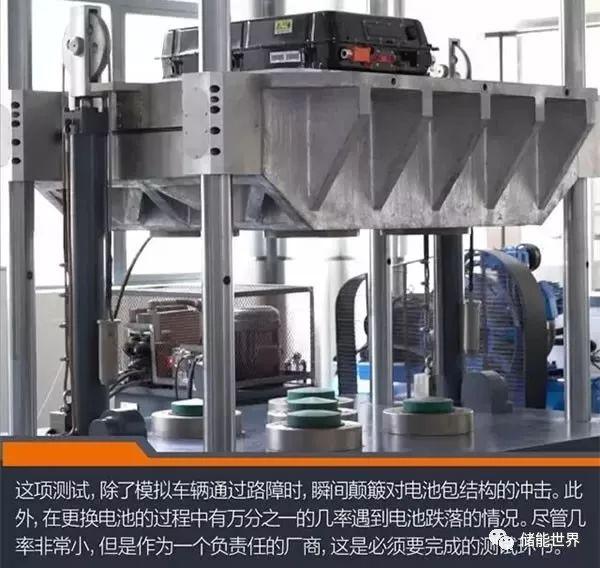 寧德時(shí)代的一座推力20噸的振動(dòng)臺(tái),用來模擬電池包在實(shí)際使用中會(huì)遇到的顛簸路況,但其振動(dòng)強(qiáng)烈程度更甚于實(shí)際路況。在試驗(yàn)中,電池包一秒鐘要被振動(dòng)200下,而電芯模組則要被振動(dòng)2000下。更加嚴(yán)苛的是電池包需要在-30℃至60℃的環(huán)境條件下,連續(xù)隨機(jī)振動(dòng)21小時(shí),這樣可等效模擬數(shù)十萬公里的行車疲勞情況。