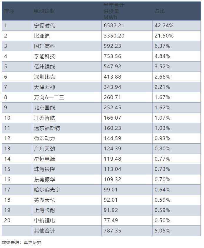 根據(jù)真鋰研究的數(shù)據(jù),今年上半年共有77家電芯供應(yīng)商為新能源汽車裝機(jī),其中寧德時代以6.58GWh的累計裝機(jī)量占比42.24%,排在首位;比亞迪半年裝機(jī)量3.35GWh,占比21.50%,排名第二;兩家合計占比63.74%。