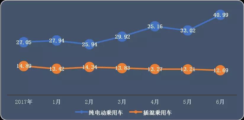 補(bǔ)貼政策推動車型結(jié)構(gòu)不斷優(yōu)化,也帶動了乘用車單車帶電量的明顯攀升。6月份,純電動乘用車的單車帶電量達(dá)到了41KWh,2017年這一數(shù)據(jù)一直在30 KWh以下,2018年4月開始越過30kWh關(guān)口,6月份歷史上首次超過40KWh。