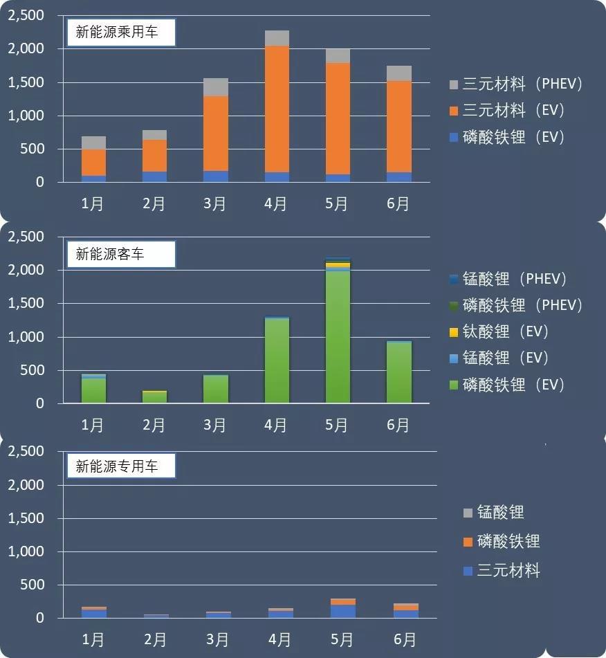 6月份磷酸鐵鋰電池裝機(jī)量銳減,1.14GWh的裝機(jī)量比5月減少了48.42%,主要受磷酸鐵鋰搭載大戶純電動客車產(chǎn)銷大幅滑坡的影響,純電動乘用車依補(bǔ)貼風(fēng)向而動,升級電池能量密度、升級續(xù)駛里程,紛紛棄磷酸鐵鋰而采用三元鋰電池,也助推了動力電池三元趨勢的走強(qiáng)。
