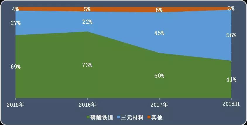 圖 3 2015年-2018年6月各類動力鋰電池裝機(jī)量結(jié)構(gòu)走勢