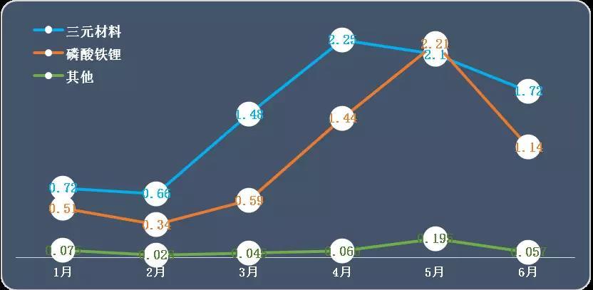 圖 2 2018年上半年主要類型動力電池月度出貨量(單位:GWh)