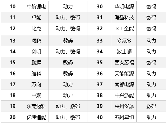 中國(guó)鋰電池電芯銷售額TOP40企業(yè)