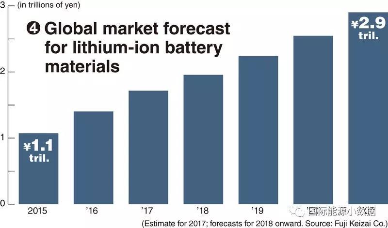 2015年全球鋰電池原料市場為1.1萬億日元(100億美元),預(yù)計(jì)2021年市場規(guī)模達(dá)到2.9萬億日元(260億美元)。
