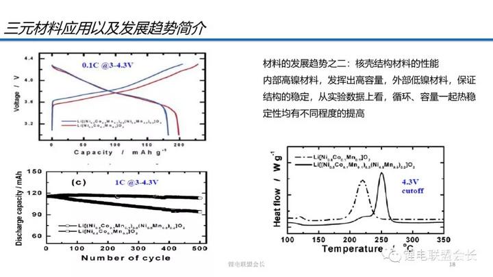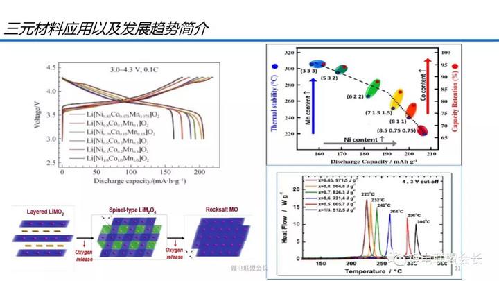 隨著鎳含量的提高,材料的容量是越來越高的,但材料的熱穩(wěn)定性是逐漸下降的,Mn可以起到穩(wěn)定結(jié)構(gòu)的作用,而Ni則不具有這個(gè)功能,隨著溫度的升高,