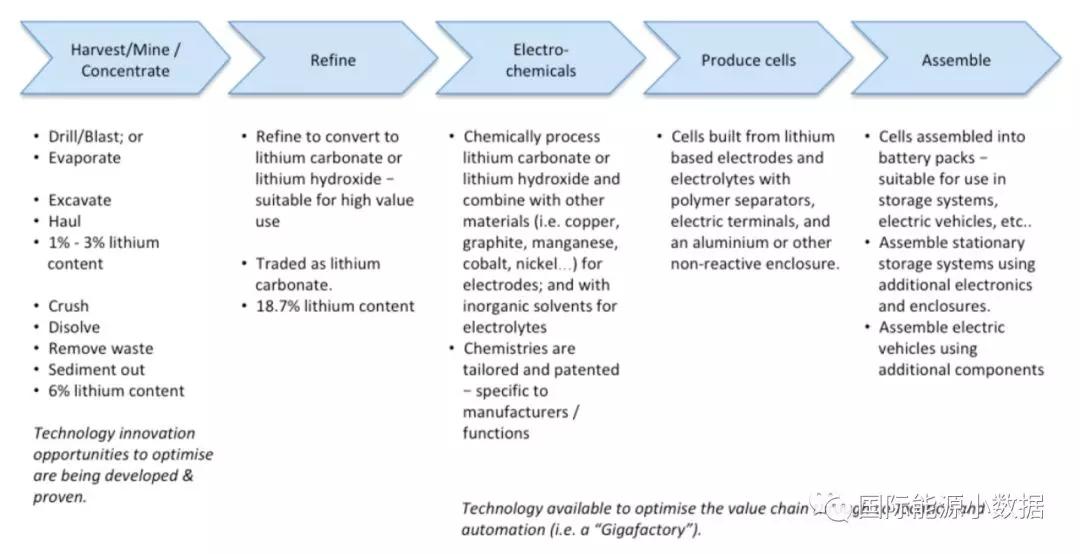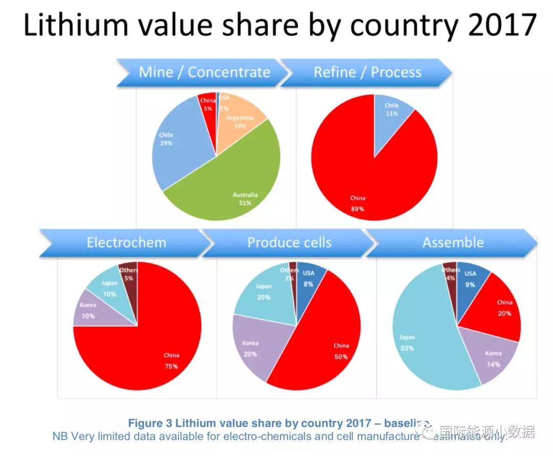 中國(guó)儲(chǔ)能網(wǎng)訊:根據(jù)澳大利亞采掘與勘探協(xié)會(huì)發(fā)布的報(bào)告,2017年全球鋰產(chǎn)業(yè)價(jià)值鏈上不同板塊上各國(guó)所占的比例如下: