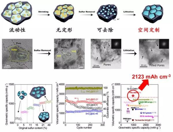 硫模板法的提出,是在三維石墨烯致密網(wǎng)絡(luò)中,巧妙利用硫如同“變形金剛”一樣的流動性、無定形,以及易去除等特點(diǎn),在碳籠結(jié)構(gòu)內(nèi)部實(shí)現(xiàn)對非碳活性顆粒如二氧化錫納米顆粒的緊密包覆。與傳統(tǒng)的“形狀”模板相比,硫模板的最大優(yōu)勢就是能發(fā)揮可塑型的體積模板作用,使緊致的石墨烯籠結(jié)構(gòu)能夠提供適形且尺寸精確可控的預(yù)留空間,最終完成針對活性二氧化錫的“量體裁衣”。這種具有合適預(yù)留空間且保持高密度的碳-非碳復(fù)合電極材料能貢獻(xiàn)出極高的體積比容量,從而大幅度提高鋰離子電池的體積能量密度,使鋰離子電池變得更小。這種 “量體裁衣”的設(shè)計(jì)思想可以拓展為普適化的下一代高能鋰離子電池和鋰硫電池、鋰空氣電池等電極材料的構(gòu)建策略。