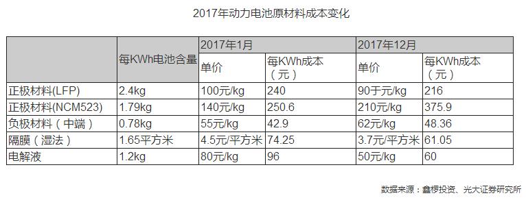2017年底較年初,磷酸鐵鋰電池原材料成本從453.15元/KWh下降到了385.41元/KWh,降幅近15%;三元鋰電池原材料成本從463.75元/KWh上漲到了545.31元/KWh,漲幅達17.6%。