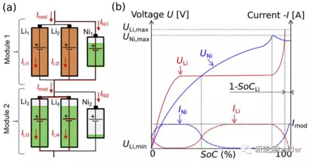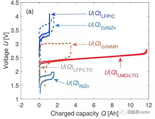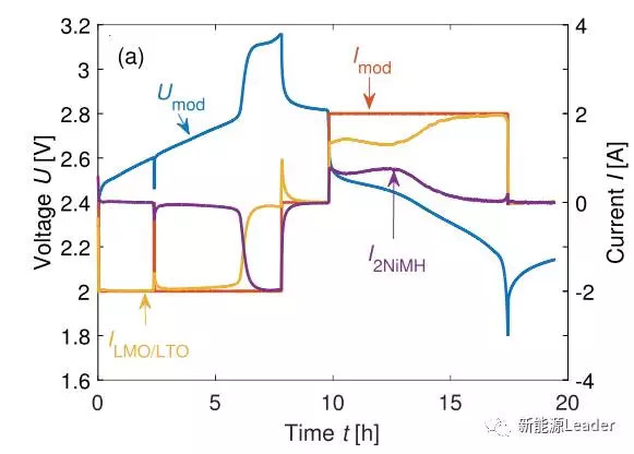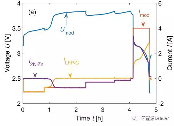 Alexander U. Schmid選取了LiFePO4和Li4Ti5O12材料作為實驗對象,原因是這兩種材料對過充都具有一定的耐受能力,并且在完全脫鋰后電壓會快速上升,此時NiMH和Ni-Zn電池承擔起電流Bypass的作用,多余的電流會流入到NiMH和Ni-Zn電池之中,從而避免鋰離子電池發(fā)生過充。