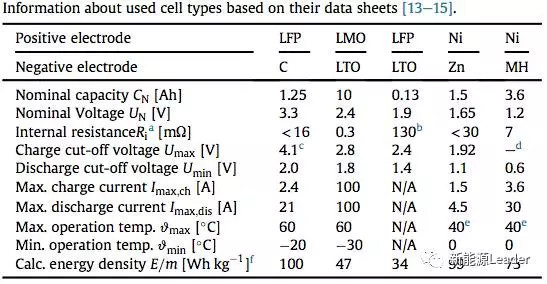 下表為實驗中使用到的電池的信息,實驗中主要用到了LFP/石墨,LMO/LTO,LFP/LTO,Ni-Zn和NiMH電池。