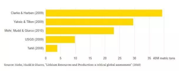 下圖是一些學(xué)者對(duì)全球鋰礦儲(chǔ)存量的研究,其中Clarke & Harben團(tuán)隊(duì)在2009年對(duì)全球鋰礦資源儲(chǔ)備的研究超過(guò)塔西勒所認(rèn)為的390萬(wàn)公噸的10倍(來(lái)源:Mohr,Mudd& Giurco - 全球性資產(chǎn)鋰礦資源和生產(chǎn))