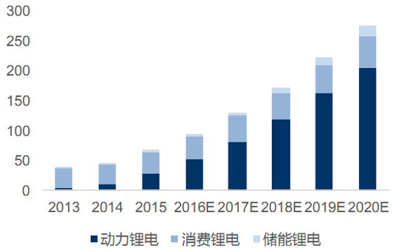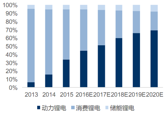 我國(guó)動(dòng)力、消費(fèi)、儲(chǔ)能鋰離子電池需求量占比