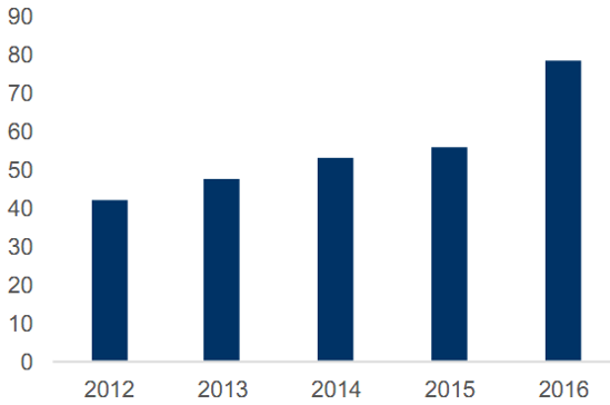 全球市場(chǎng)規(guī)模2020年有望達(dá)到4500億。2016年受新能源汽車(chē)政策推動(dòng),我國(guó)鋰離子電池年產(chǎn)量飆升至78億只,同比增長(zhǎng)高達(dá)40%。全球鋰離子市場(chǎng)規(guī)模近年穩(wěn)定上升,2016年全球規(guī)模達(dá)2158億元,2011-2016年復(fù)合增長(zhǎng)率21%。預(yù)計(jì)2020年全球鋰離子電池市場(chǎng)規(guī)模有望達(dá)到4500億元,其中我國(guó)鋰離子電池市場(chǎng)規(guī)模有望達(dá)到3000億元。