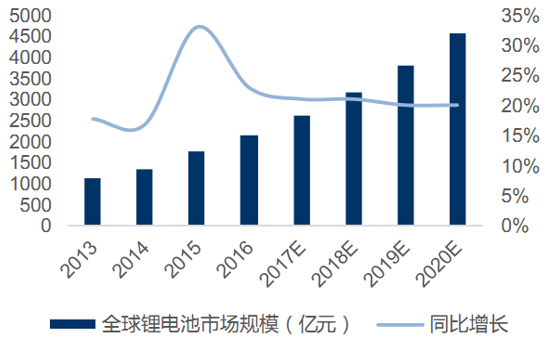全球鋰離子電池市場(chǎng)規(guī)模(億元)