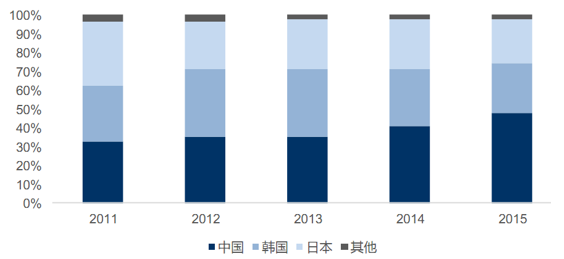 中國(guó)鋰離子電池出貨量在全球市場(chǎng)占比變化