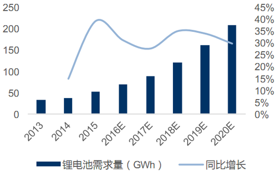VR、無(wú)人機(jī)、可穿戴設(shè)備等新增需求帶動(dòng)消費(fèi)鋰離子電池增長(zhǎng)。盡管傳統(tǒng)手機(jī)、筆記本電腦、數(shù)碼產(chǎn)品等發(fā)展減慢,近年來(lái)出現(xiàn)的多種新型產(chǎn)業(yè)增加了對(duì)消費(fèi)鋰離子電池的需求,如VR眼鏡、無(wú)人機(jī)、可穿戴設(shè)備等。中國(guó)虛擬現(xiàn)實(shí)(VR)行業(yè)從2015年開(kāi)始起步,市場(chǎng)規(guī)模正處于飛速擴(kuò)張時(shí)期;根據(jù)預(yù)測(cè),2017年VR行業(yè)規(guī)模將從2016年的約60億元增長(zhǎng)至超過(guò)130億元,同比增長(zhǎng)約140%;到2020年預(yù)計(jì)超過(guò)550億元,2016-2020年復(fù)合增長(zhǎng)率接近80%。根據(jù)預(yù)測(cè),全球民用無(wú)人機(jī)市場(chǎng)規(guī)模也呈快速擴(kuò)張趨勢(shì)。2015年全球民用無(wú)人機(jī)市場(chǎng)規(guī)模為36億美元,同比增長(zhǎng)率33%;到2020年,全球民用無(wú)人機(jī)市場(chǎng)規(guī)模增長(zhǎng)到約260億美元,五年復(fù)合增長(zhǎng)率近50%。2012年發(fā)布的GoogleGlass,2014年發(fā)布的小米手環(huán),2015年面市的蘋(píng)果手表,相繼將智能穿戴推向了風(fēng)口浪尖。根據(jù)預(yù)測(cè),2016-2020年,智能眼鏡出貨量的年復(fù)合增長(zhǎng)率高達(dá)200%左右,智能服裝超過(guò)60%,智能手表接近30%。